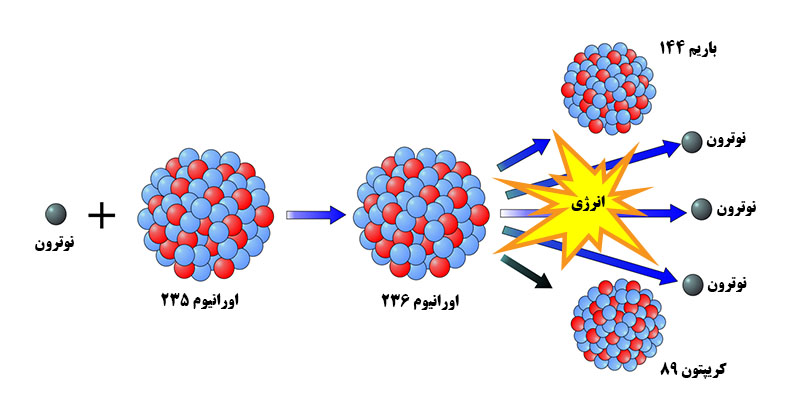 ۲۳۵۹۲U + ۱۰n→ ۱۴۰۵۶Ba + ۹۳۳۶Kr + 3 ۱۰n + Energy